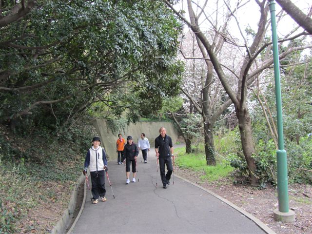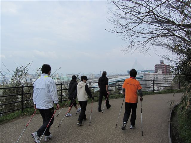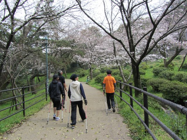 ポールウォーキングは体の前で突きます。