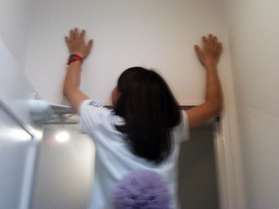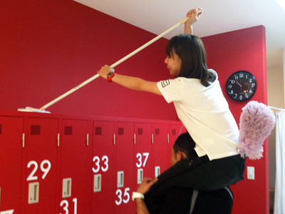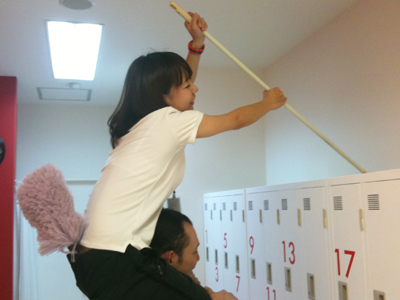 厳しい掃除指導を受けながらマットを拭き拭き。