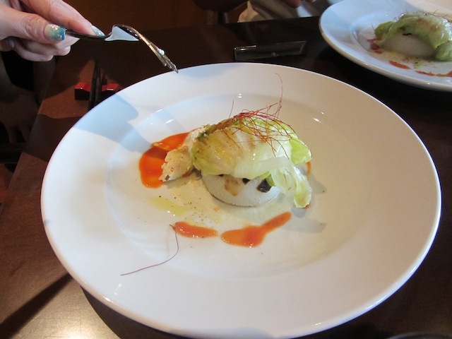 レンコンとお豆腐のつくねをレタスで包んで蒸した上にはキャベツのソース